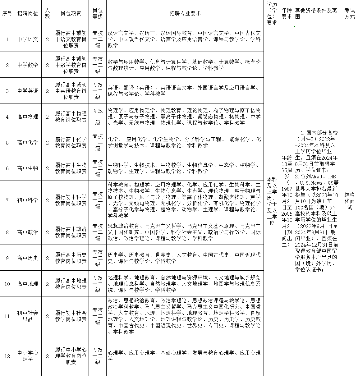 1.高中物理、化學、生物崗位可兼報初中科學,高中政治、歷史、地理可崗位兼報初中社會。兼報者未進入第一崗位簽約名單的,其成績在兼報崗位中仍然有效。